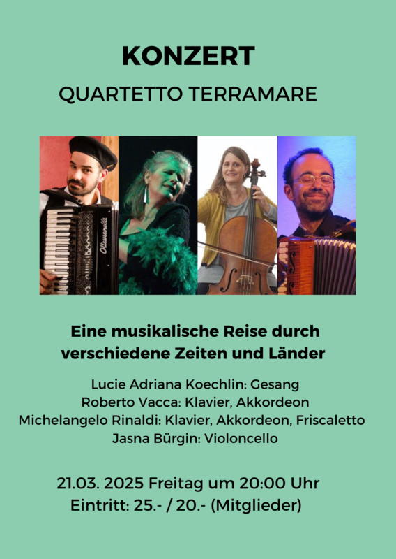 | März 2025 | Quartetto Terramare Eine musikalische Reise durch verschiede Zeiten und Länder Lucie Adriana Koechlin, Gesang |